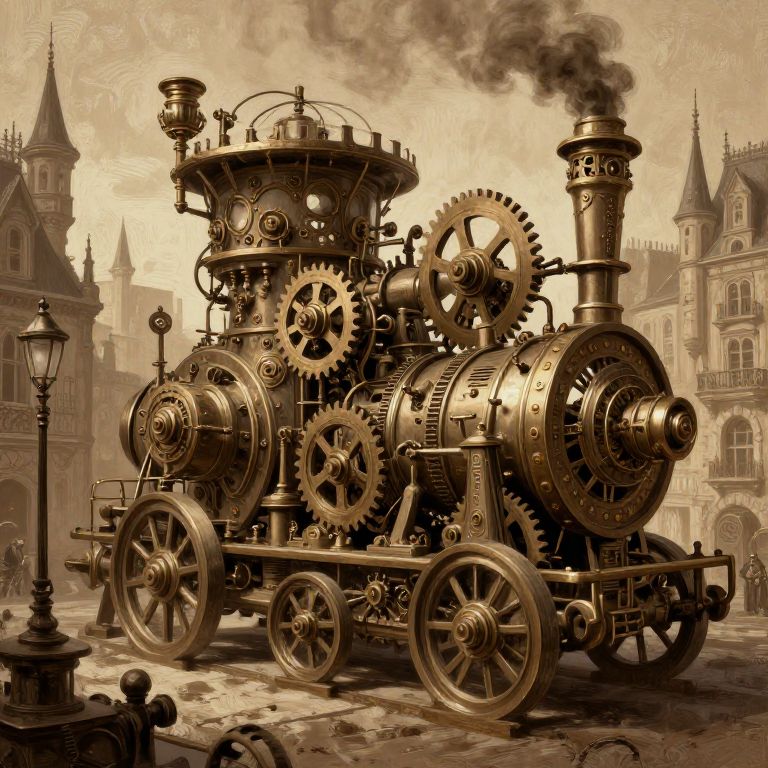 Sepia-toned digital art of an intricate, steam-powered, gear-driven locomotive with large wheels and smokestack, set against a Victorian-style city