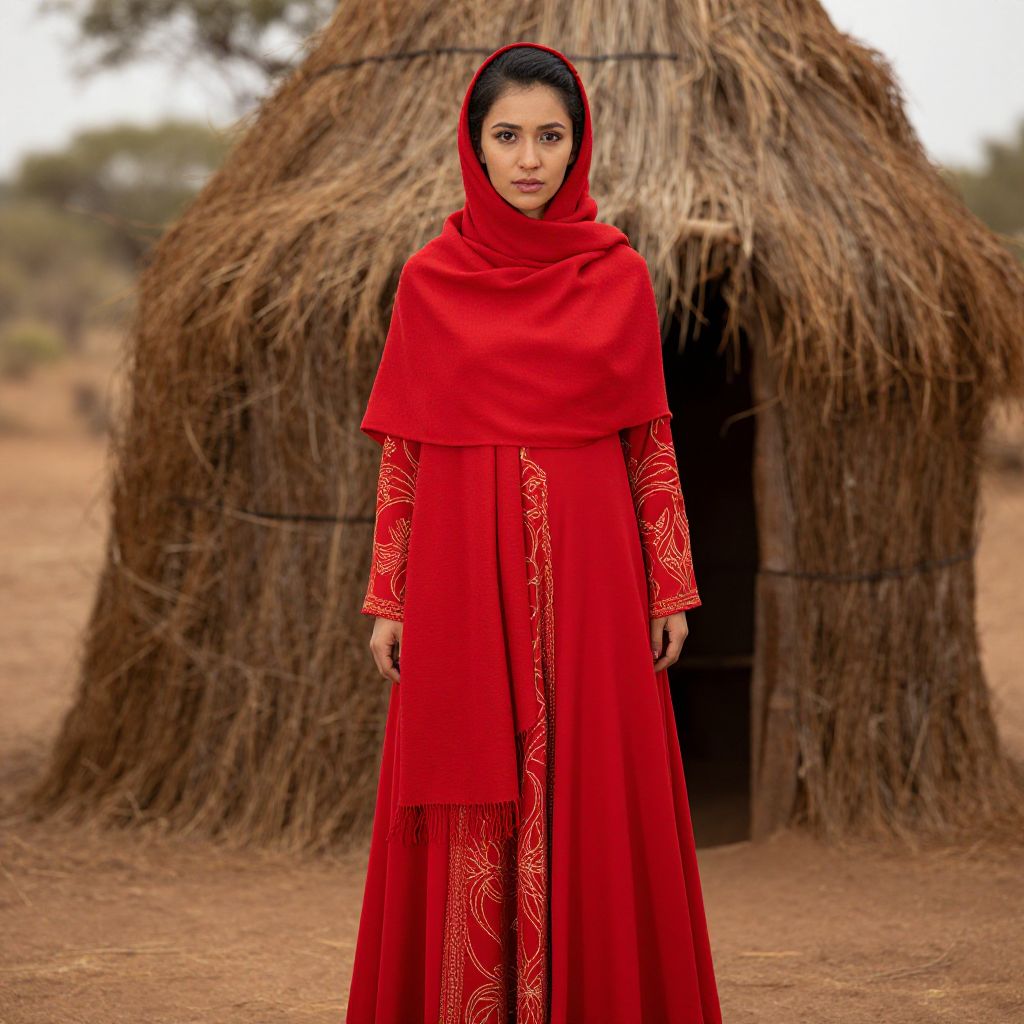 "Zulu Attire Married Woman Costume, woman in a red dress and head scarf standing in front of a hut"