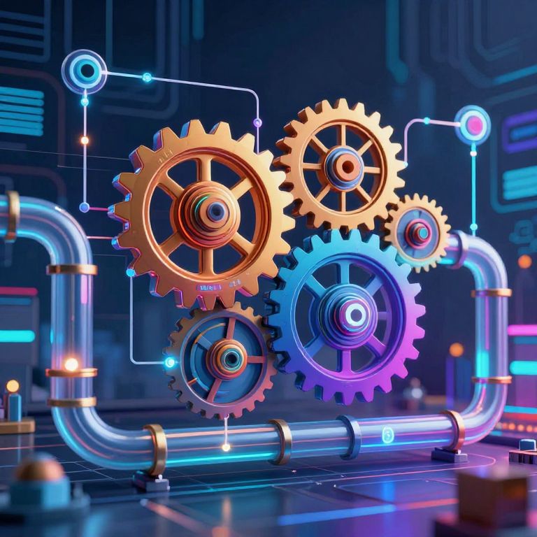 Digital illustration of glowing, interconnected gears in gold and blue, floating above futuristic, neon-lit pipes and circuitry in a cyberpunk-style background.