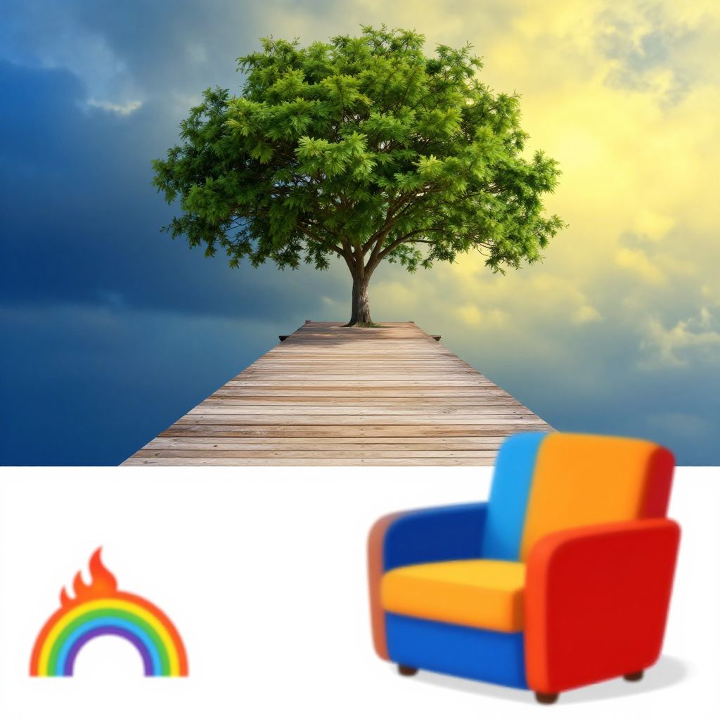 This image combines a photograph and a digital illustration. The top part shows a wooden pier leading to a solitary tree with lush green leaves, set against a dramatic sky with dark blue clouds on the left and a bright, yellowish sky on the right. Below, there's a colorful, modern armchair with vibrant blue, orange, and red patches. The bottom left corner features a rainbow and flame emblem.