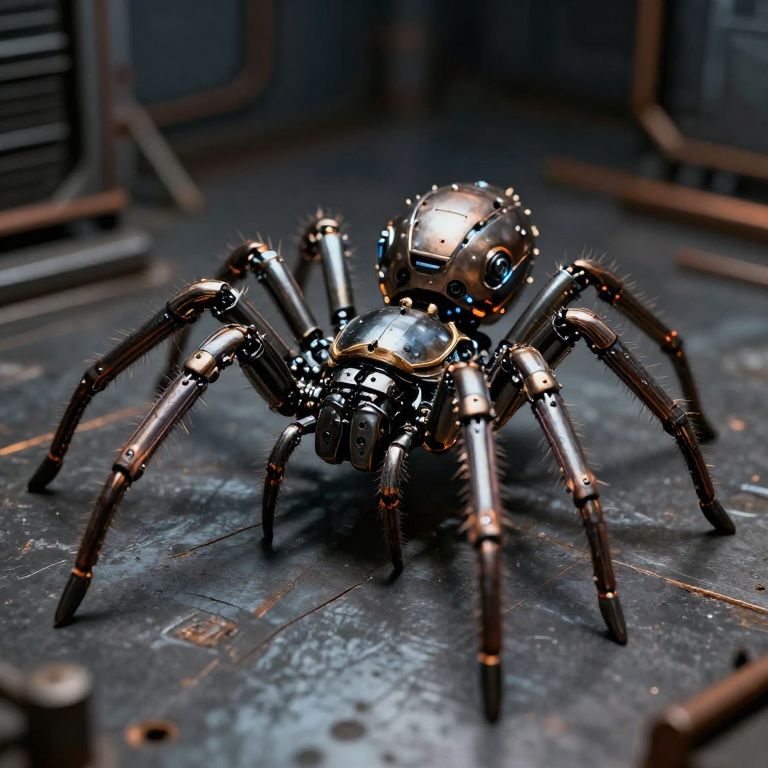 A futuristic, robotic spider with mechanical limbs and a metallic exoskeleton, set against a dark, industrial background.