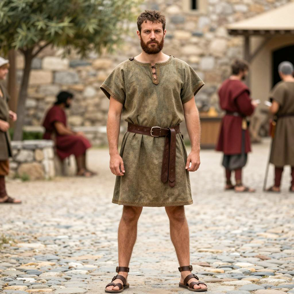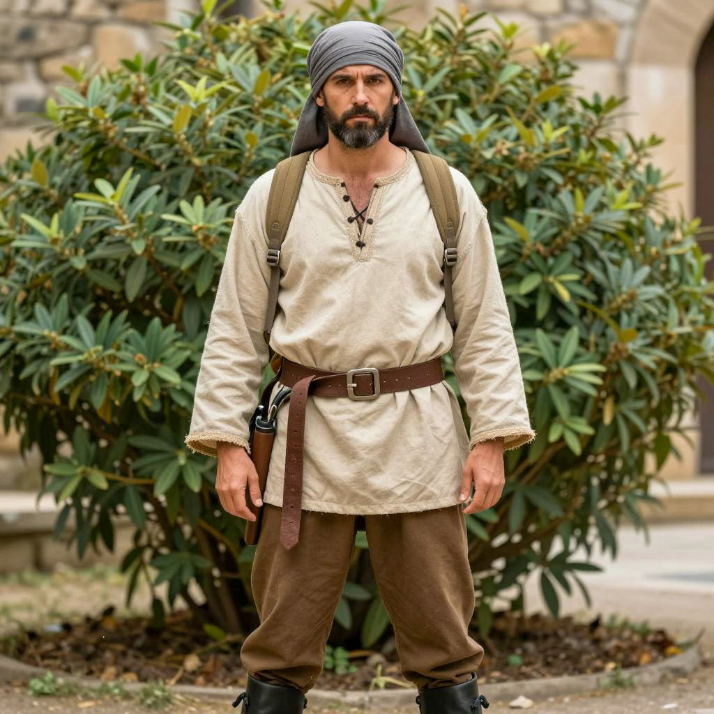 Medieval male wedding outfit, photograph of a handsome man with a beard, standing in a colorful garden, wearing a maroon long-sleeved tunic with buttons, beige sash, and a beige scarf draped over one shoulder, short brown hair, serious expression, sunlight, tall green plants, orange and pink flowers in the background, blurred trees in the distance, daytime, realistic style
