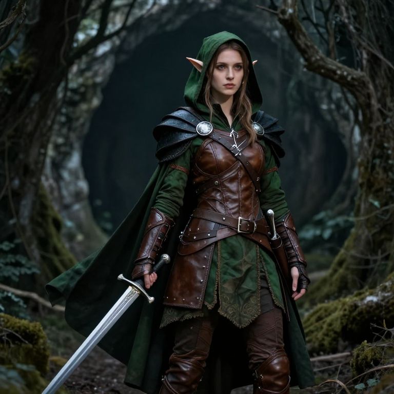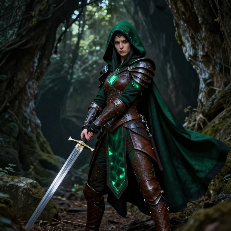Fantasy archer outfit, intricate leather armor with emerald and gold accents, layered with forest green fabric, flowing cape, detailed quiver with carved wooden arrows, standing in an enchanted forest with glowing magical runes, soft ambient lighting
