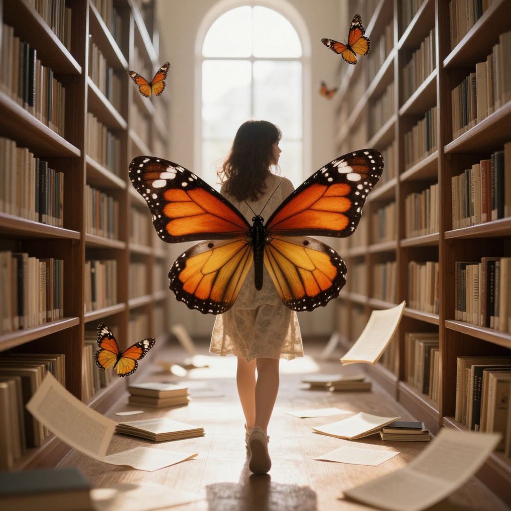 A young woman with vibrant monarch butterfly wings gracefully walks through an endless library aisle, surrounded by swirling butterflies and scattered pages, as sunlight streams through a distant window, casting an ethereal glow over the surreal scene.
