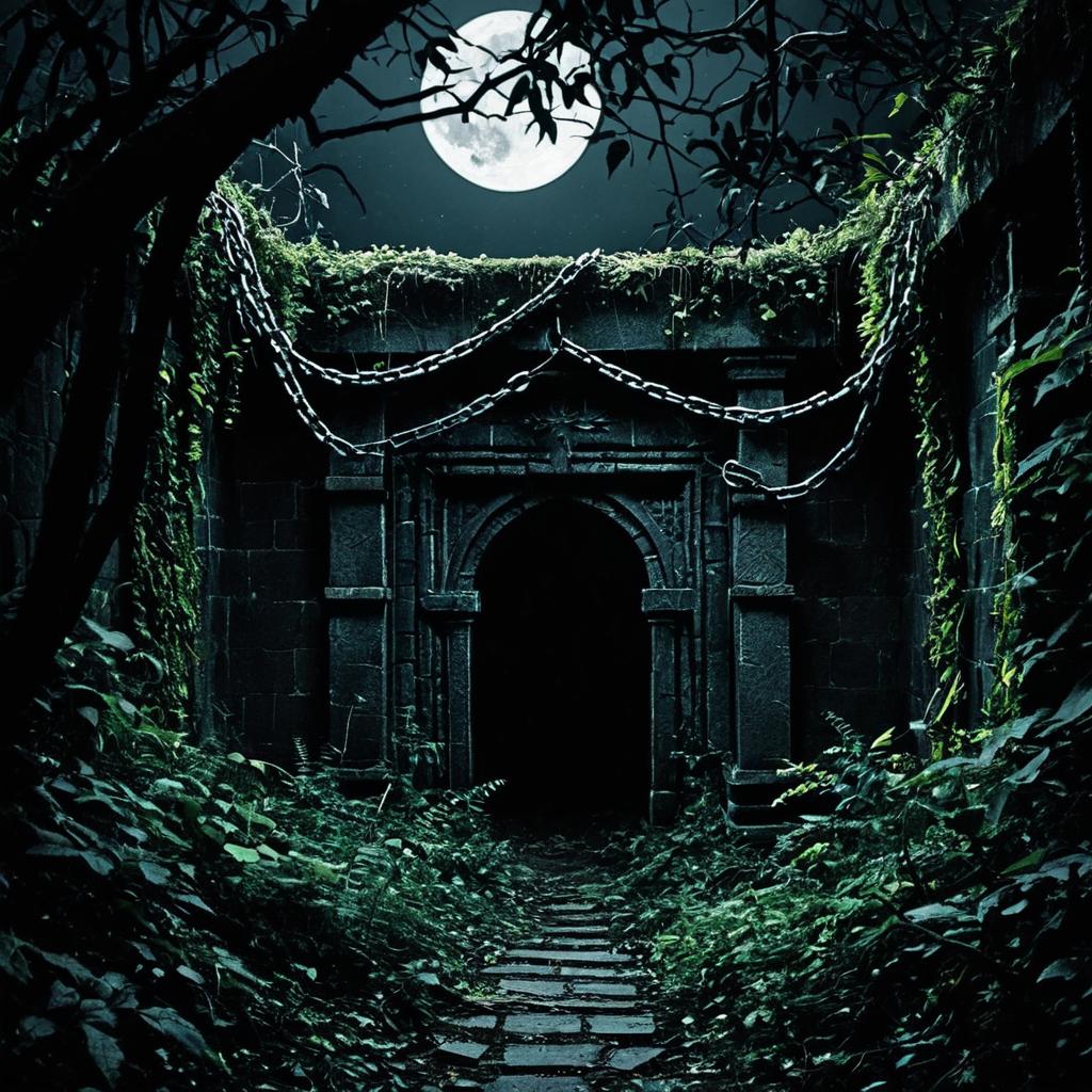 A cryptic forgotten dungeon, where the fear of the unknown lurks behind every chains, and the moonlight casts ghostly silhouettes among the thick foliage, evoking a sense of dread and intrigue.