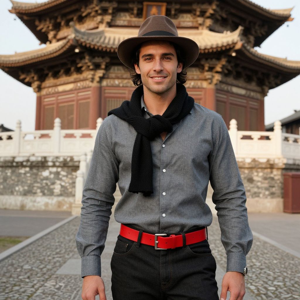 A handsome man in his late 20s, with dark, wavy hair and a confident smile, wearing a brown fedora hat, a black scarf draped around his neck, and a grey button-down shirt cinched with a vibrant red belt. He is standing on an aged, textured sidewalk directly in front of a beautifully detailed, multi-tiered pagoda building bathed in warm sunlight.