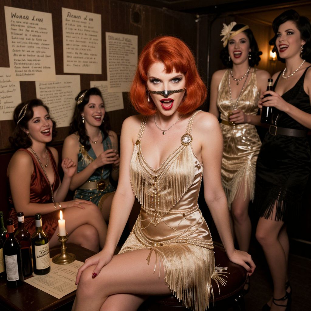 A daring Prohibition party girl with a fiery red bob, intense eyes, and a determined nose, wearing a layered beaded fringe dress with a vintage brooch, sitting in a candle-lit basement room filled with handwritten protest flyers and vintage bootleg bottles, laughing with a group of women in flappers' outfits, the atmosphere electric with rebellion and forbidden joy