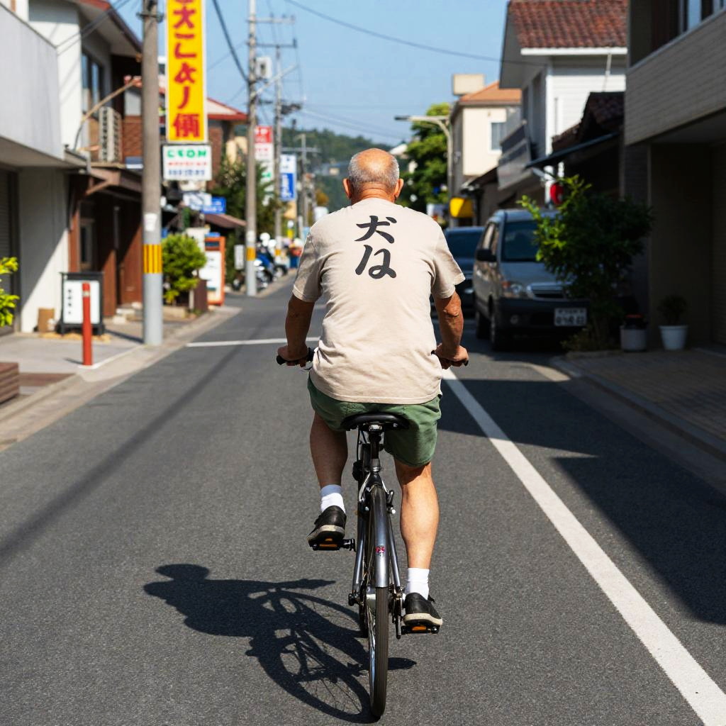 Photograph of an older man with a bald head and medium build, riding a bicycle down a sunlit urban street. He's wearing a beige t-shirt with black Japanese characters on the back, green shorts, and white socks. The street is lined with buildings, colorful signs, and power lines against a bright blue sky. Shadows stretch across the road, adding contrast to the vibrant scene.