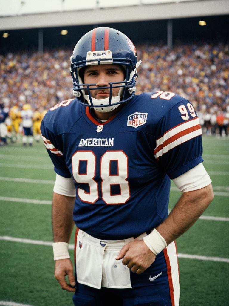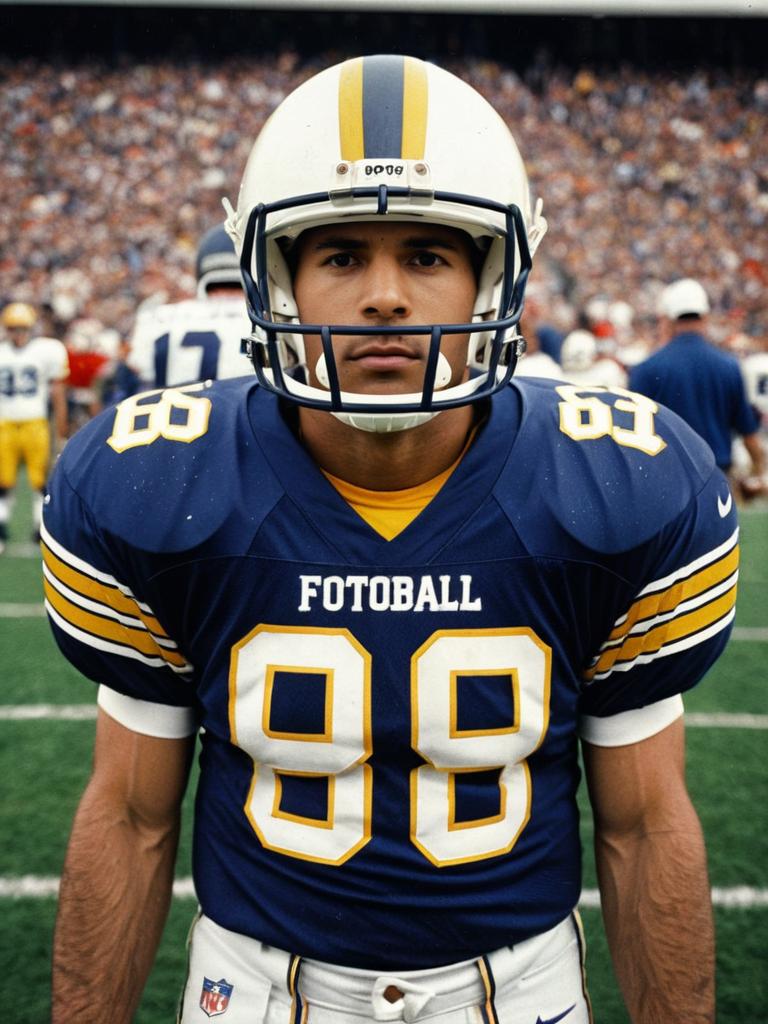 Close-up portrait of an American football player wearing a blue and yellow uniform with number 88 and helmet. The player is standing on a football field with a stadium crowd blurred in the background.