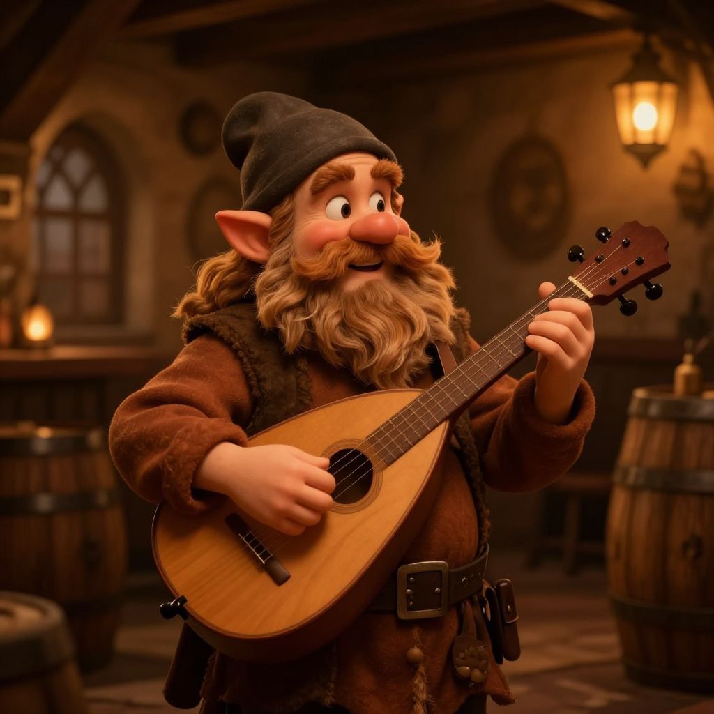 Dwarf character art of a jovial dwarf bard with a thick braided beard, playing a lute in a cozy tavern filled with wooden barrels and glowing lanterns, warm color palette, highly detailed environment and cosy fantasy vibe.