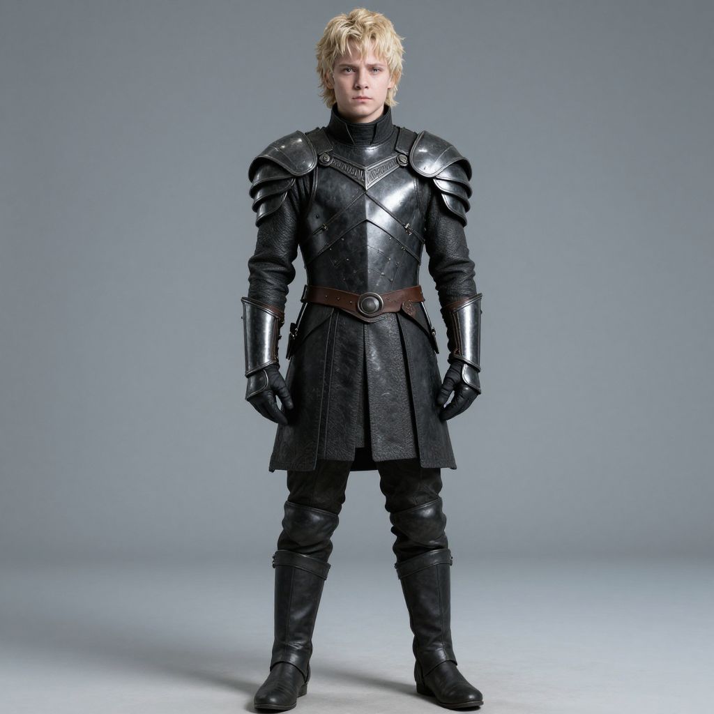 Game thrones costume, armor, 1boy, solo, male focus, blonde hair, standing, shoulder armor, gloves, pauldrons, full body, boots, gauntlets, looking at viewer, black gloves, closed mouth