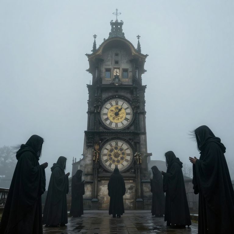 In a fog-shrouded realm where time stands still, cloaked figures gather around an ancient clocktower, their whispers carried by the wind as they grapple with the weight of eternity and the haunting echoes of what was lost.