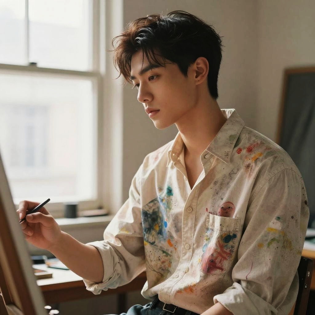 Photograph of a young, fair-skinned man with tousled brown hair, wearing a beige, button-up shirt adorned with colorful abstract paint splashes. He stands in a softly lit room, gazing to the left with a contemplative expression. The background includes a window with sunlight streaming in, a wooden desk with a pencil holder, and shelves with various items. The man's casual, artistic attire and the room's warm, creative ambiance suggest an artist or painter's studio setting. The image captures a moment of introspection and creativity.