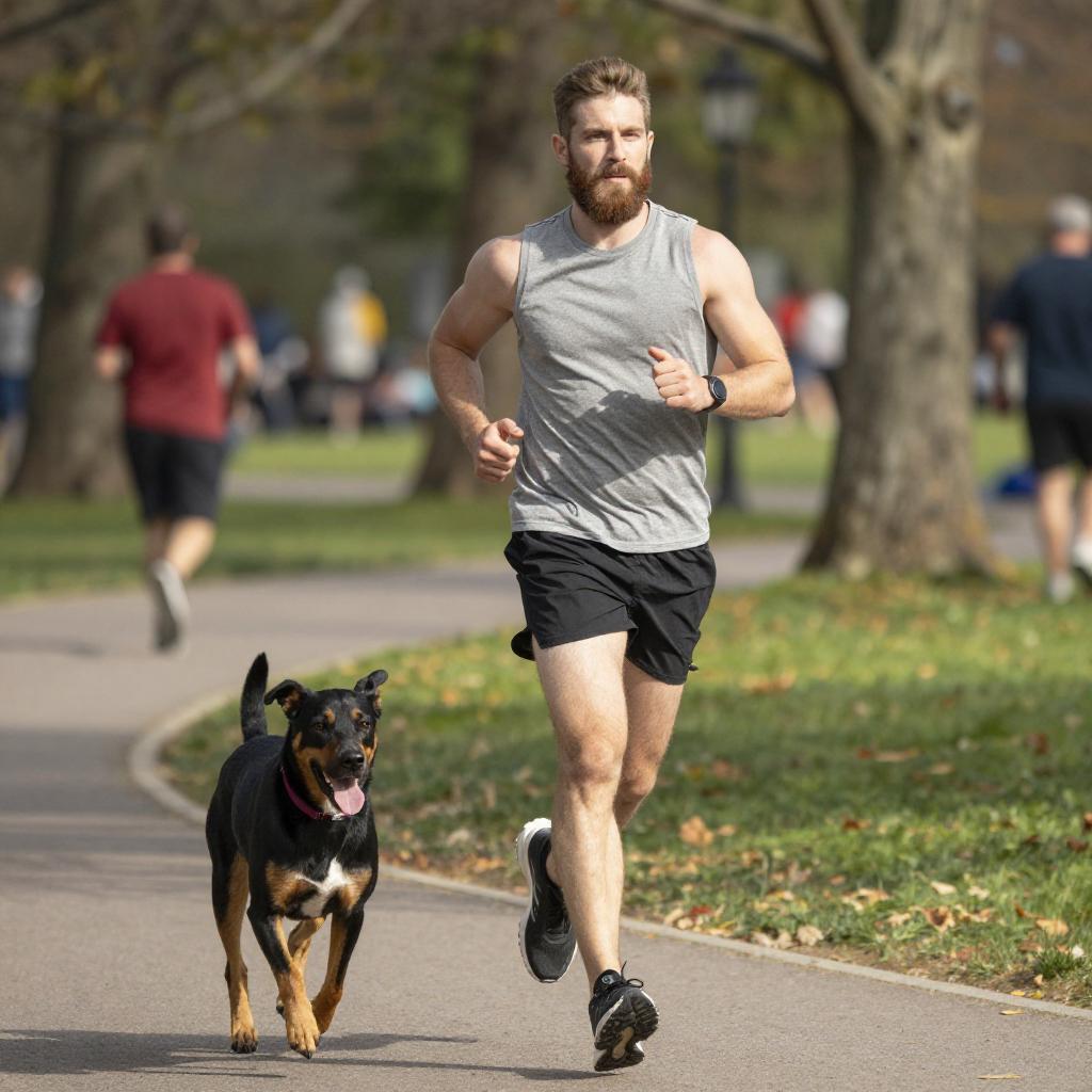 Photograph of a muscular, bearded man with short brown hair running in a park. He's wearing a gray sleeveless shirt, black shorts, and black running shoes. A black and brown dog with its tongue out runs beside him. The background is blurred, showing trees and other park-goers. The scene is bright and sunny, with green grass and scattered leaves on the ground.