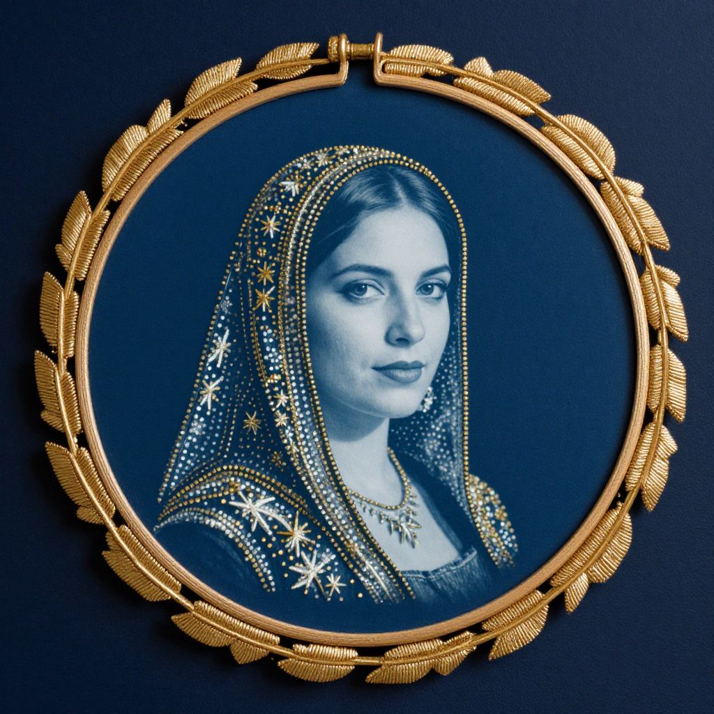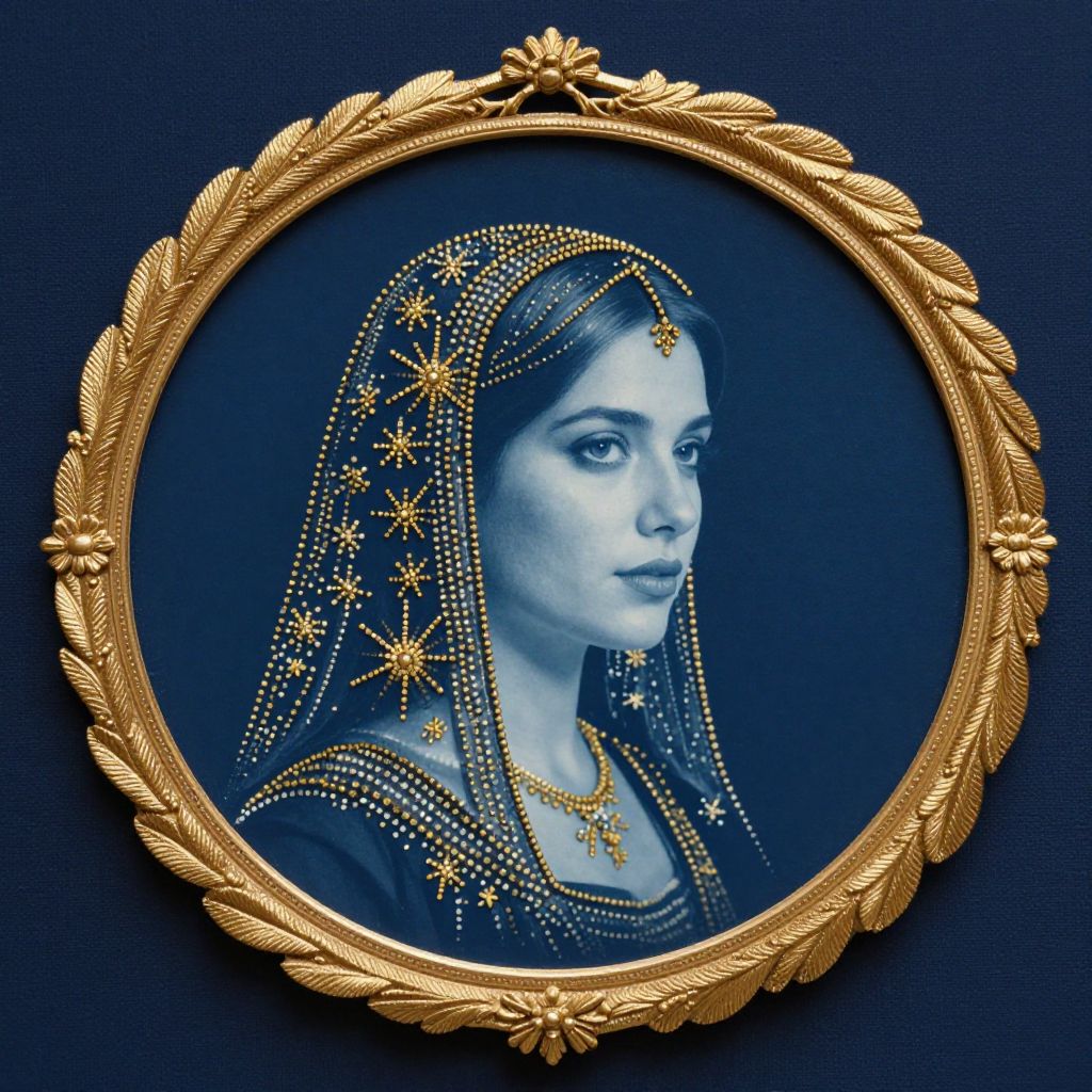 Cyanotype portrait of a woman with intricate gold beading and star patterns, elegantly framed within a circular gold-leafed embroidery hoop against a deep navy background.