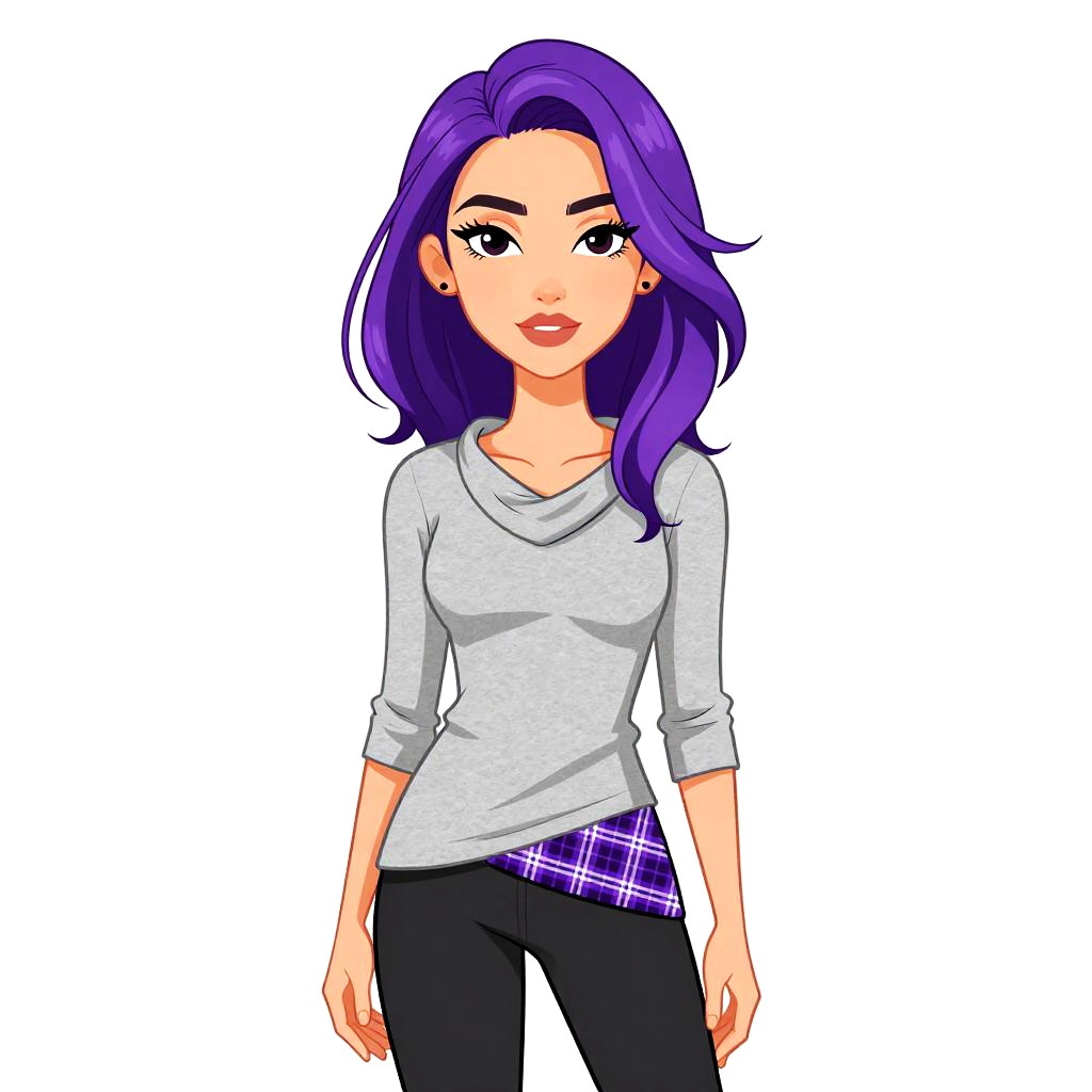 Woman with pretty face and pretty hair. Woman, casual contemporary, layered look with mixed textures, light heather gray cowl neck top, three-quarter length sleeves, plaid underlay with an asymmetrical hem peaking below, fitted black leggings, white background. --sref 1467