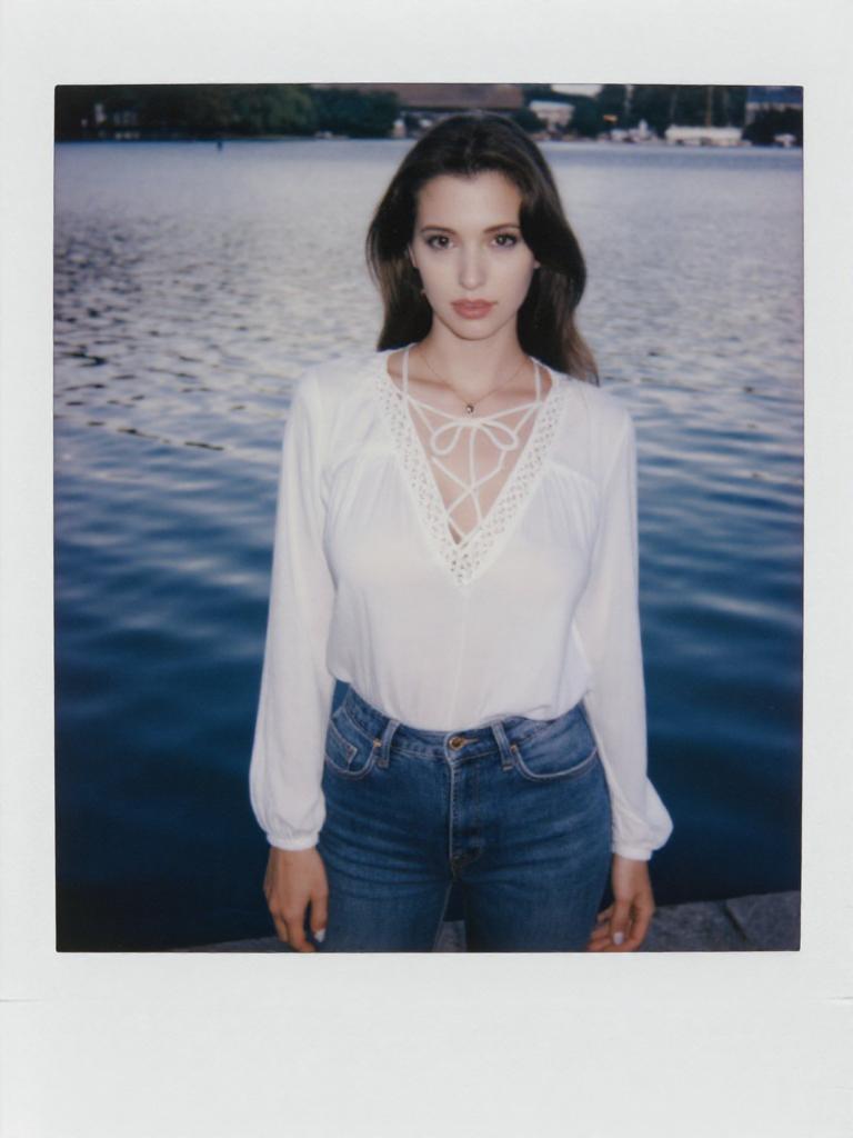 A woman, casual chic in a white blouse with lace-up neckline and blue skinny jeans, standing by a serene lake, captured in the style of a polaroid instant camera. Sexy. Pretty face and beаutiful eyes. Big breasts