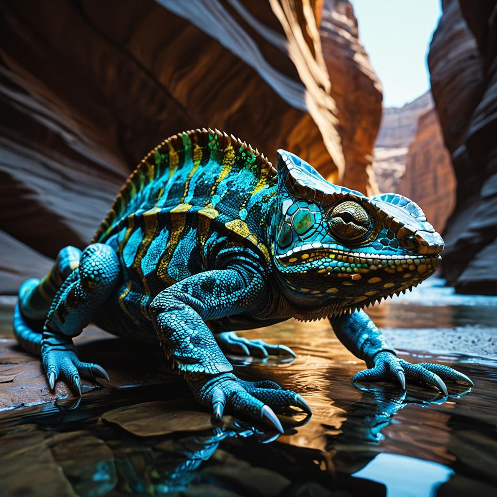 A glowing crystal-armored chameleon-lizard hybrid emerges from the ancient flooded sandstone canyon, envisioned in the style of art nouveau and Zaha Hadid, captured with a macro lens, shallow depth of field, ultra-detailed digital painting, cinematic lighting, photorealistic, epic Octane render.