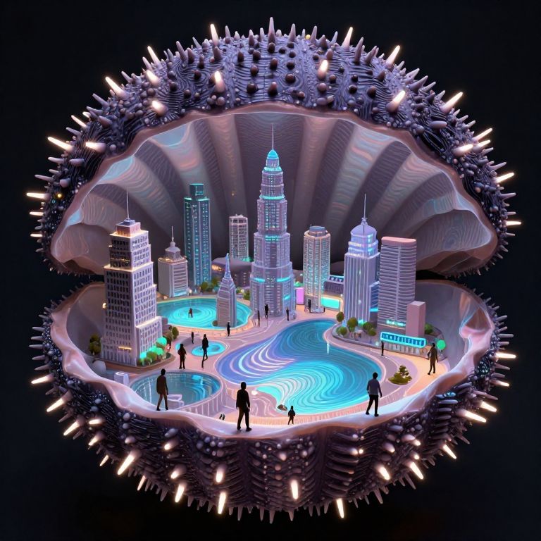 Digital CGI artwork depicting a futuristic cityscape inside a glowing, bioluminescent, shell-like structure. The city features towering skyscrapers with neon blue and white lights, a central circular lake with swirling blue patterns, and small figures of people walking and standing around. The shell's interior is illuminated with soft, pink and purple lights, while the exterior has a spiky, metallic texture. The scene combines elements of sci-fi and surrealism, with a dark, starry background framing the vibrant city within the shell. The overall style is highly stylized and futuristic.