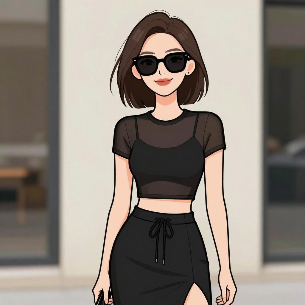 Illustration of a young woman with long brown hair wearing oversized black sunglasses, a vibrant floral print bomber jacket, black ribbed tank top, and a pastel blue A-line mini skirt. She is standing on a street with blurred urban background, holding a black handbag.