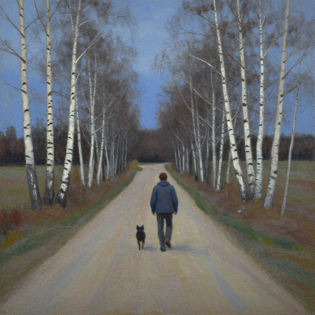 "Rotate oil painting inspired by Abraham Hunter of a dirt road, a man walking a dog through a white birch forest at twilight some stars, expressive brush strokes, impasto, bluish tones, textural,"