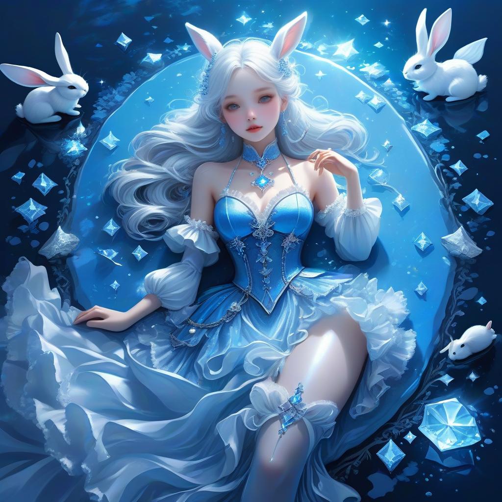 A highly detailed digital fantasy artwork of a serene girl with icy platinum hair, lying peacefully on a shimmering blue surface resembling water or crystal. She is dressed in an elegant, form-fitting blue gown with intricate ruffles and thigh-high stockings. Glowing swords levitate around her, and she holds a floating charm ringed with starlight. A white rabbit with glowing pendant looks up at her affectionately. The scene is illuminated by radiant, magical blue light creating an ethereal, serene ambiance. Detailed reflections and sparkling effects enhance the mystical atmosphere.