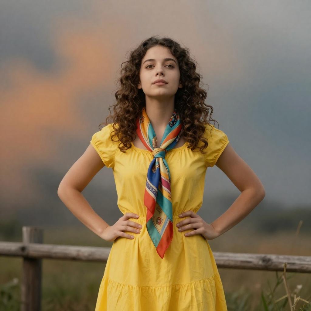 Photograph of a young woman with curly brown hair, wearing a yellow dress and colorful scarf, standing with hands on hips, looking up. Background features a smoky sky with orange and blue hues, and a wooden fence with greenery below.