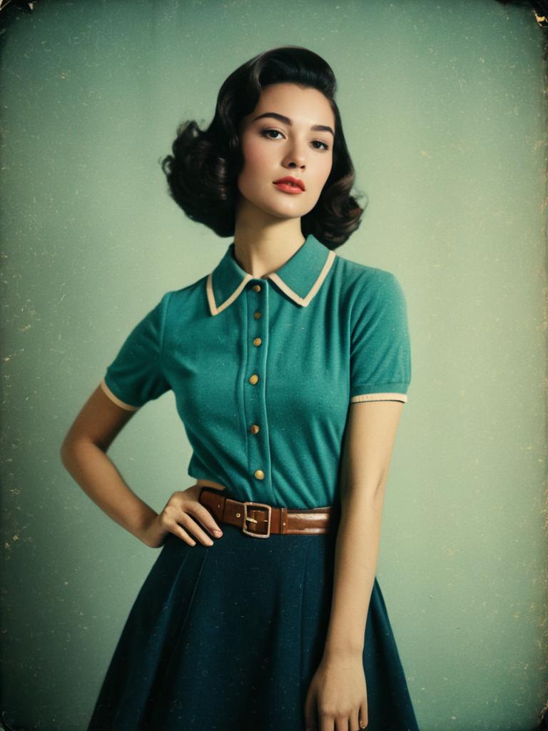 Woman, casual chic, olive green fitted polo shirt, short sleeves, button-up collar, tucked into a high-waisted navy blue corduroy mini skirt, black leather shoulder bag, black platform oxford shoes, minimal jewelry, white backdrop --sref 1387