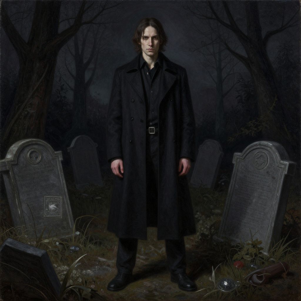 Photograph of a pale, serious-looking man with long, dark brown hair standing in a dimly lit, spooky graveyard at night. He wears a black, long, double-breasted overcoat with a belt, black shirt, and black boots. Two old, weathered gravestones with ornate tops are positioned behind him, partially obscured by dark, barren trees. The ground is covered in dry grass and scattered debris, including a broken glass bottle in the foreground. The overall mood is eerie and gothic, with deep shadows and a dark, bluish-gray color palette.