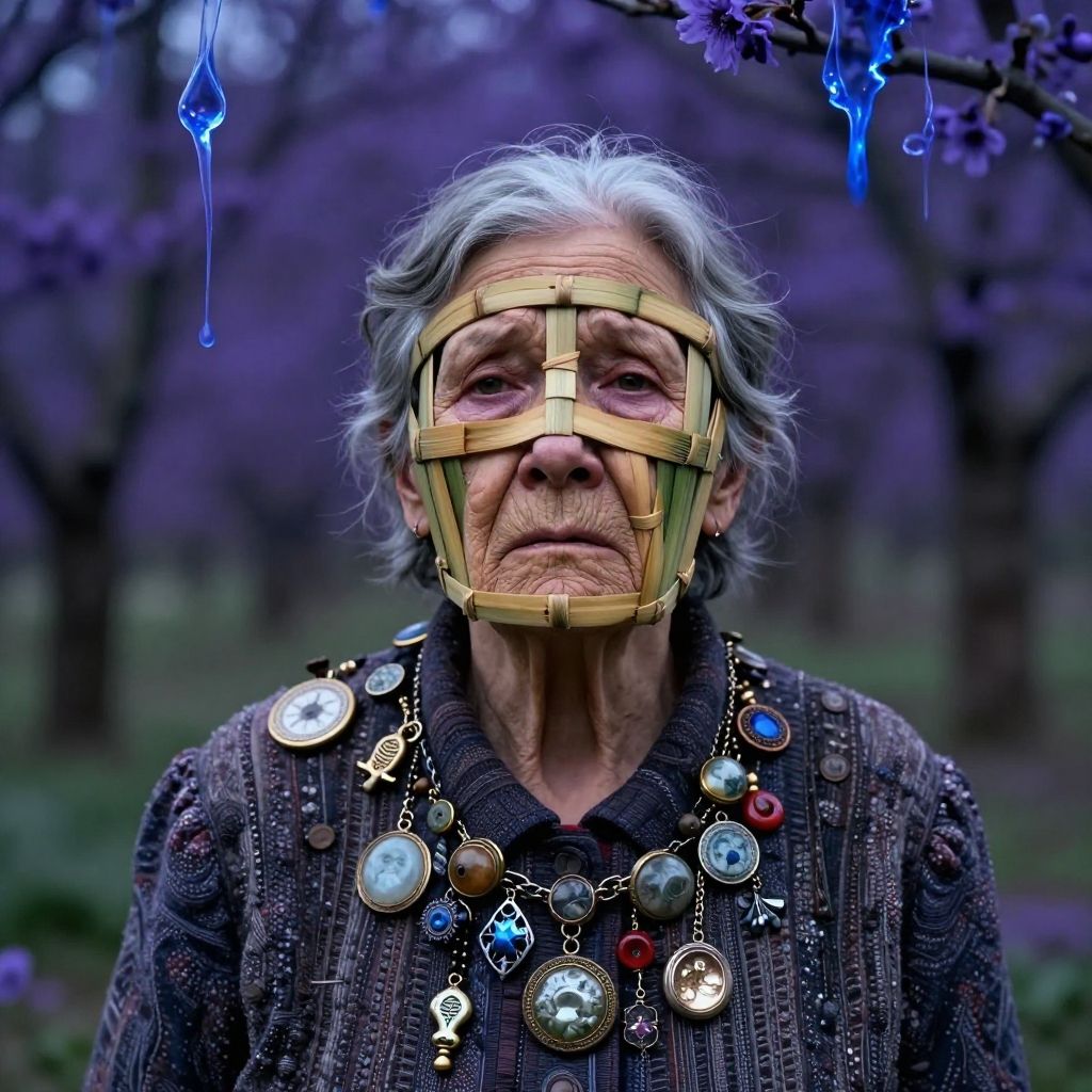 Photograph of an elderly woman with gray hair wearing a wooden mask, adorned with large circular jewelry, in a purple-hued forest. Blue droplets