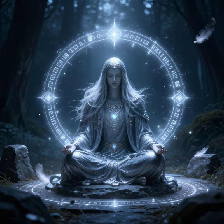 A digital artwork depicting a serene, fair-skinned woman with long, flowing white hair, seated in a lotus position in a dark, mystical forest. She wears a silver circlet and a detailed, glowing blue pendant, with a silver robe that drapes over her form. Her hands rest on her knees, palms up. A luminous, circular magical symbol encircles her head, adorned with glowing runes and a central light. Feathers float around her, and a glowing orb rests on the ground near her feet. The forest background is dark and ethereal, with soft moonlight filtering through the trees.