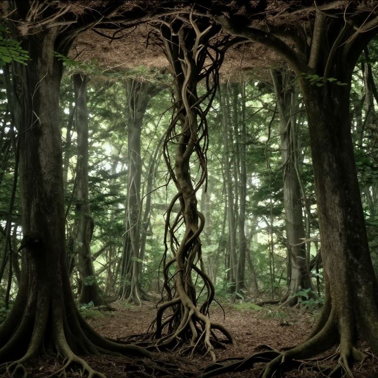 Photograph of a dense forest with a central tree featuring twisted, vine-like roots forming an intricate, vertical pattern amidst tall, straight trees and vibrant green