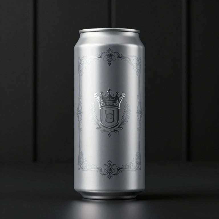 The image showcases a highly detailed, matt silver energy drink can with a super premium feel, rendered in high resolution at 8k. The can features a small, intricate royal insignia embossed in the center, surrounded by ornate designs that add to its regal appearance. The surface of the can is smooth with subtle textures, reflecting light in a way that highlights its metallic sheen. The can is positioned against a black panel background, which contrasts sharply with the silver, making the can stand out prominently. The overall composition is balanced, with the can centered and the background providing a clean, uncluttered backdrop that emphasizes the can's details and craftsmanship.
