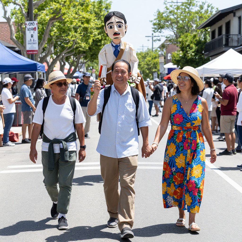 Photograph of three smiling adults walking in a sunny outdoor festival. The man in the center, with short black hair, wears a white shirt, beige pants, and a black backpack, carries a large puppet of a man with a white face and black top hat. To his left, an older man with gray hair, wearing a white t-shirt, green pants, and a beige hat, carries a white bag. On the right, a woman with dark brown skin, curly hair, and wearing a colorful floral dress and straw hat, walks hand in hand with the central man. The background shows trees, festival tents, and a "NO PARKING" sign.
