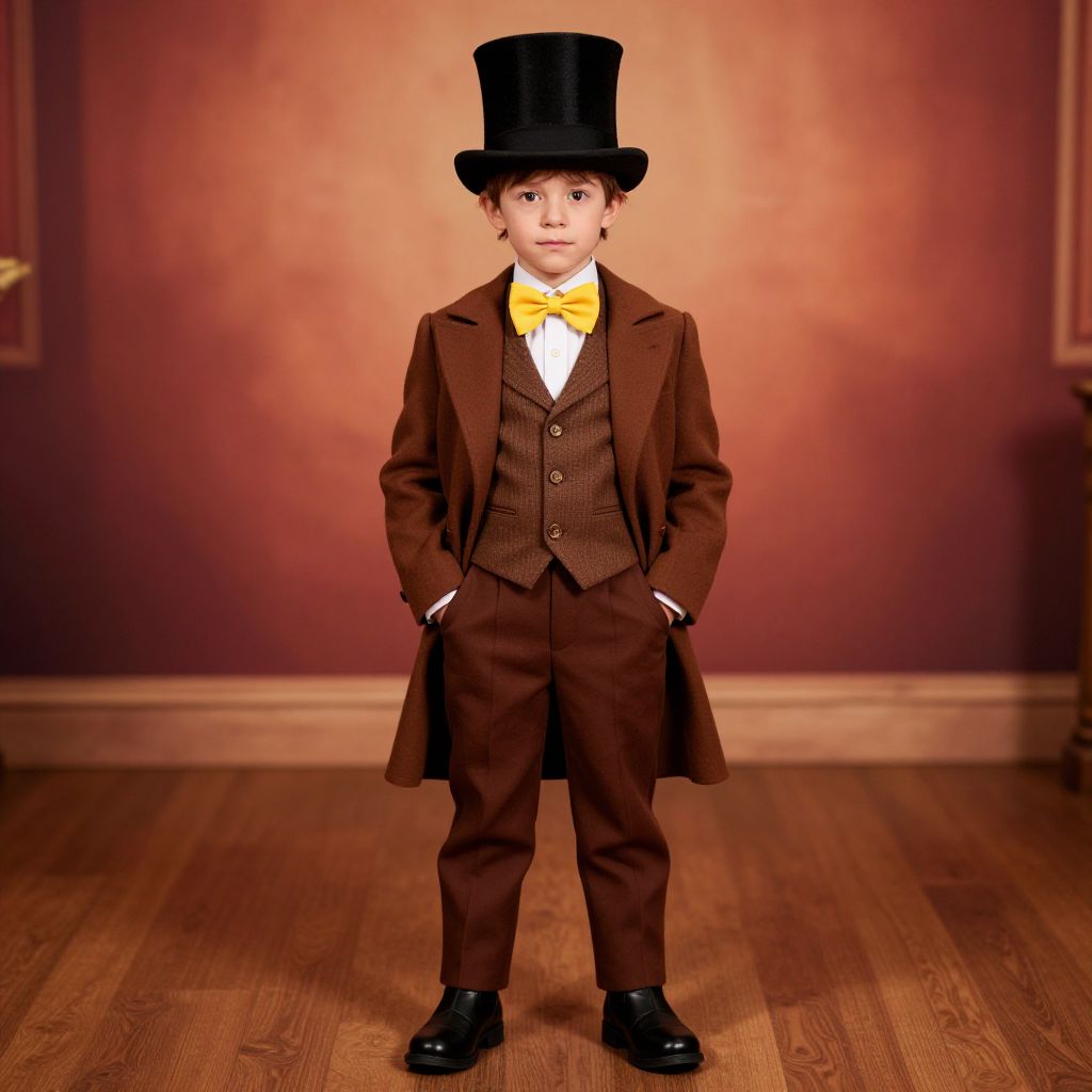 Willy wonka chocolate bar, solo, 1boy, male focus, hat, vest, pants, jacket, standing, full body, hands in pockets, looking at viewer, coat, open clothes, black footwear, indoors, top hat, closed mouth, shirt, bow, shoes, buttons, bowtie, open jacket, boots, yellow bowtie