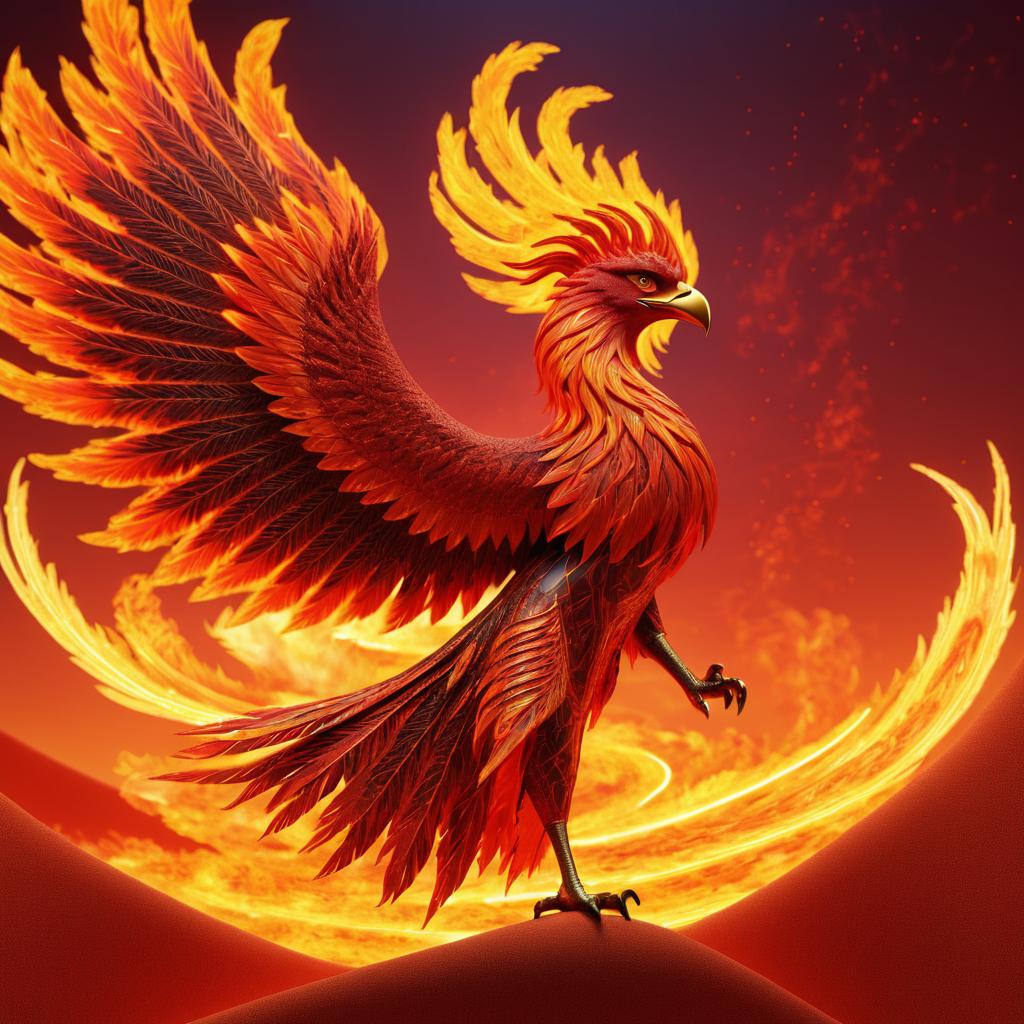High-quality 3D render of a transforming phoenix with flaming wings and body, set in a fiery infernal arena. The mythical bird is depicted with intricate feather details and a glowing sun-like orb behind its head, embodying psychological themes. Inspired by the artistic styles of Gustav Klimt and Jean-Michel Basquiat.