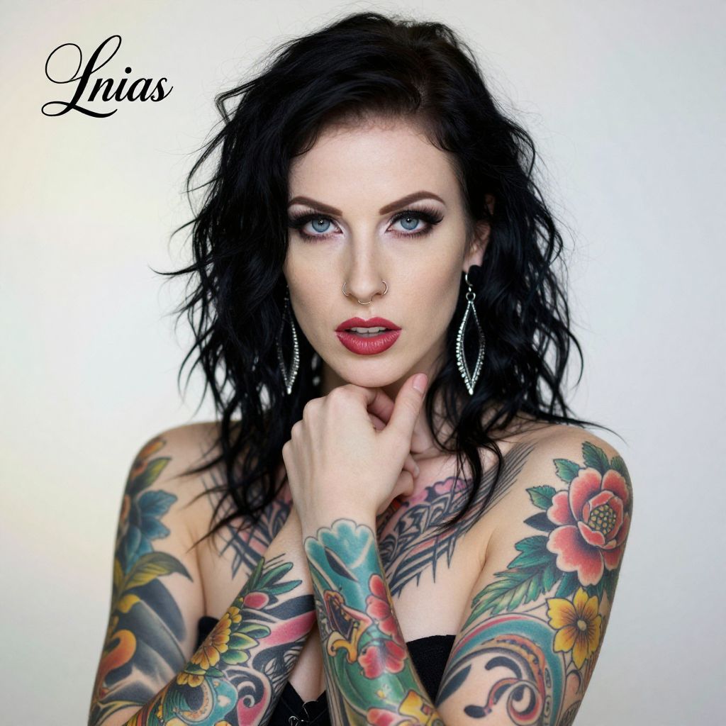 Photograph of a pale-skinned woman with dark, wavy hair and intense blue eyes. She's heavily tattooed, with colorful designs covering her arms and chest. She's wearing red lipstick and has a nose ring and large, dangling earrings. Her right hand is touching her chin. The background is softly blurred with a gradient of light colors. There's an elegant black script logo in the top left corner.