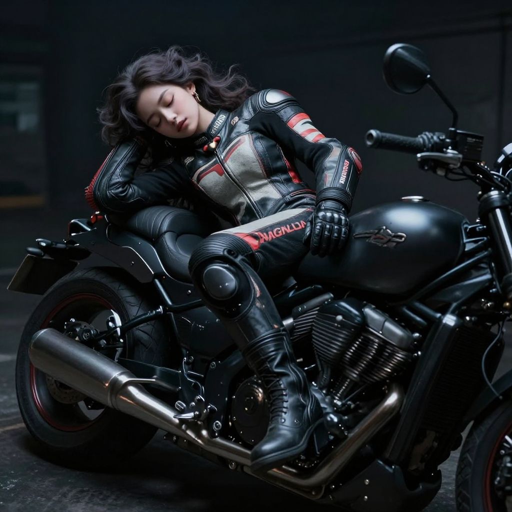 Photograph of an Asian woman with long, wavy black hair, asleep on a sleek, black motorcycle. She wears a black and silver leather racing suit with red accents and black boots. The motorcycle, with shiny chrome exhaust and detailed engine, has a logo on the fuel tank. The background is dark and blurred, emphasizing the motorcycle and the woman. The image has a moody, dramatic lighting, highlighting the glossy textures of the leather suit and motorcycle. The woman's relaxed posture and closed eyes convey a sense of tranquility amidst the powerful, mechanical surroundings.