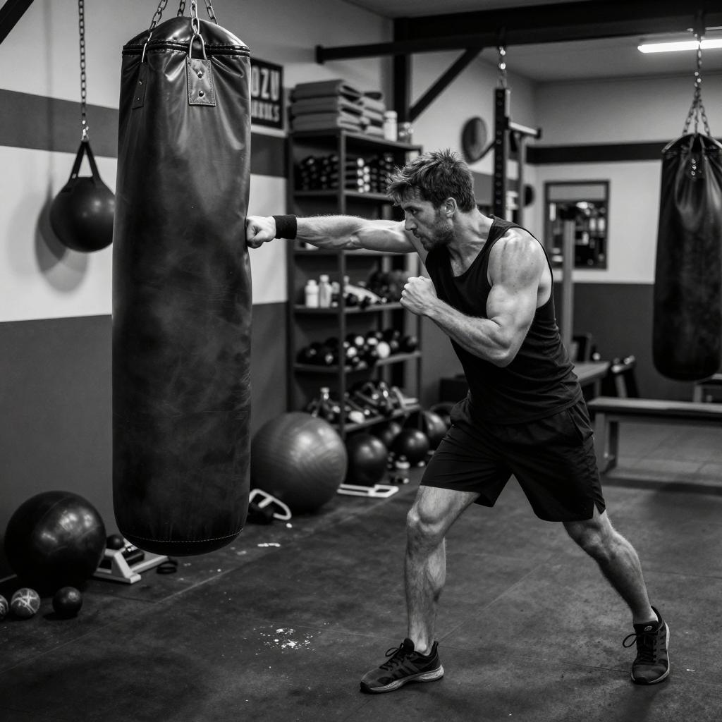 Black-and-white photograph of a shirtless, muscular man with short hair and a necklace, leaning forward over a bathroom sink. His intense expression shows concentration. He holds a hairbrush in his right hand. A towel is on the sink, and a lamp and small shelf with items are in the background. Mirror frame is in the foreground.