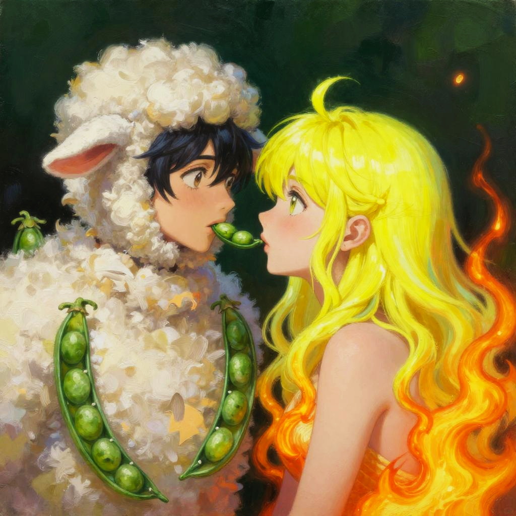 (realistic:1.1), anime, oil color, (1girl, 1boy ), lip, sheep costume, snow peas, dark green gradient background, fluorescent yellow hair, Mermaid waves hair, Flaming, slave, (masterpiece, best quality, niji style)