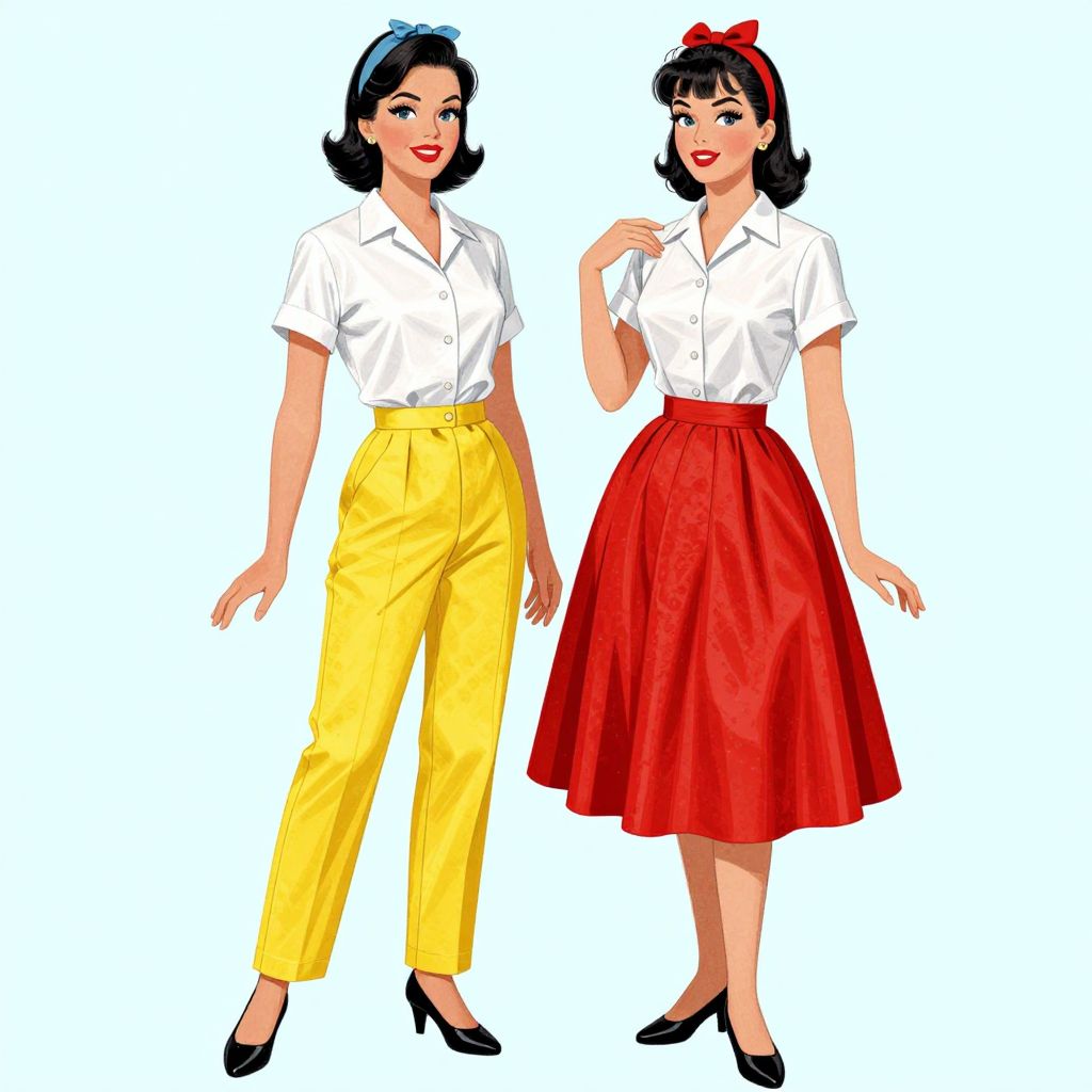 A colorful digital illustration of three stylish women in mid-20th century fashion. The woman on the left wears a white, short-sleeved, knee-length dress with a belted waist and white heels, accessorized with a small tiara. The woman in the center dons a vibrant orange, short-sleeved, knee-length dress with a bow at the neckline and matching orange heels, topped with an orange headband. The woman on the right is in a light purple, short-sleeved blouse with white accents, paired with a navy blue, high-waisted, knee-length skirt and black heels. All three women have short, curled hair and are smiling, standing against a plain white background.