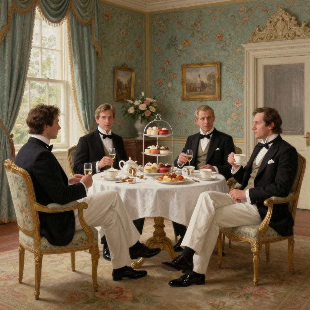 Gentlemans enjoying a refined afternoon tea in an elegant Victorian parlor, surrounded by ornate furniture and floral wallpaper, soft natural light from large windows, realistic painting style