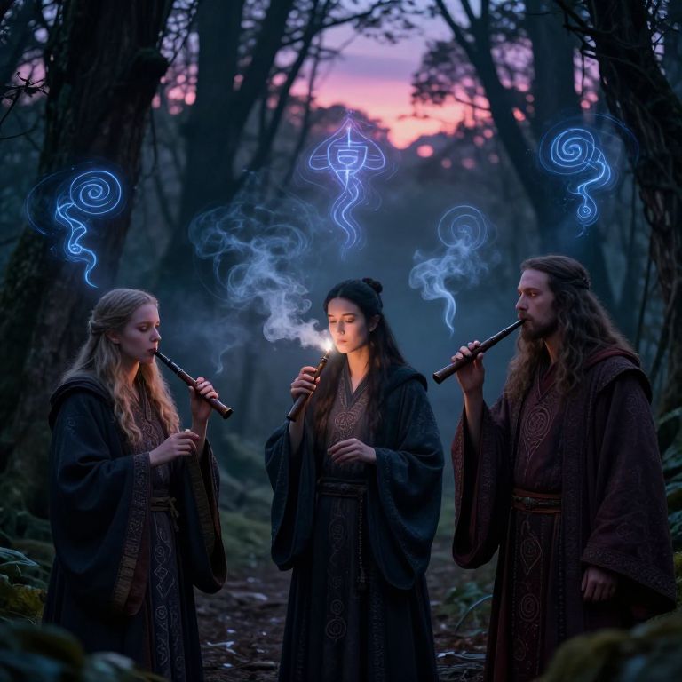 Photograph of three long-haired, forest-dressed individuals smoking pipes, surrounded by blue, mystical smoke patterns in a twilight forest.