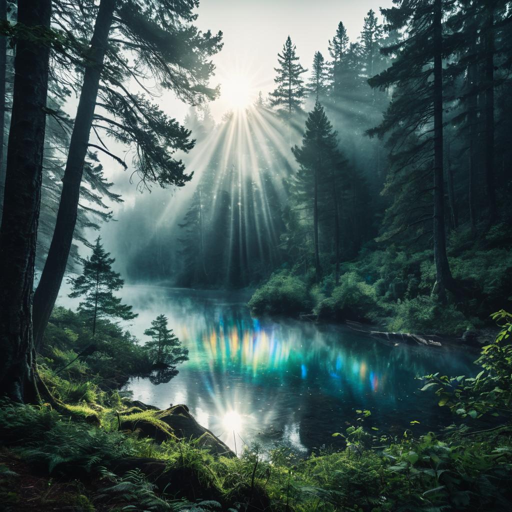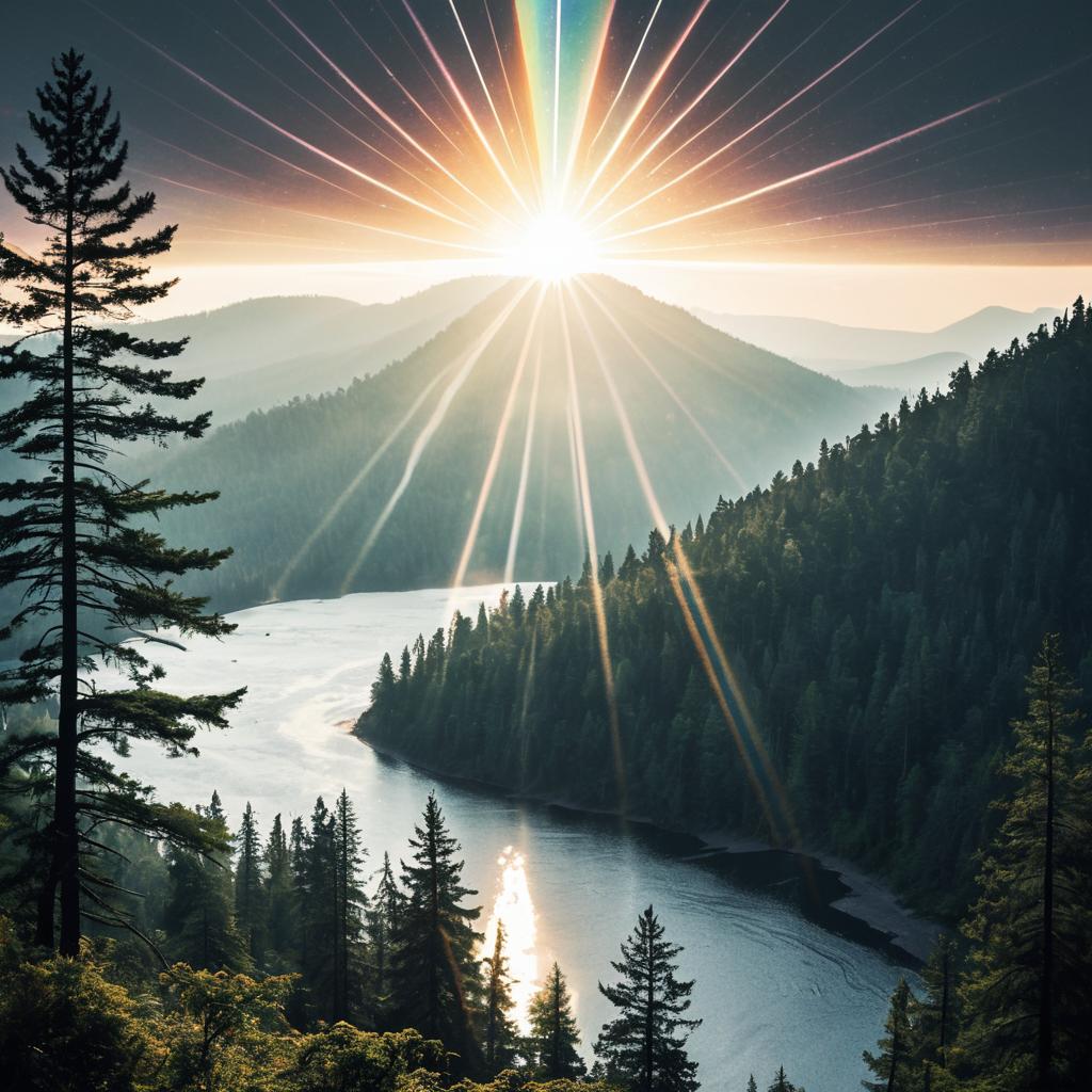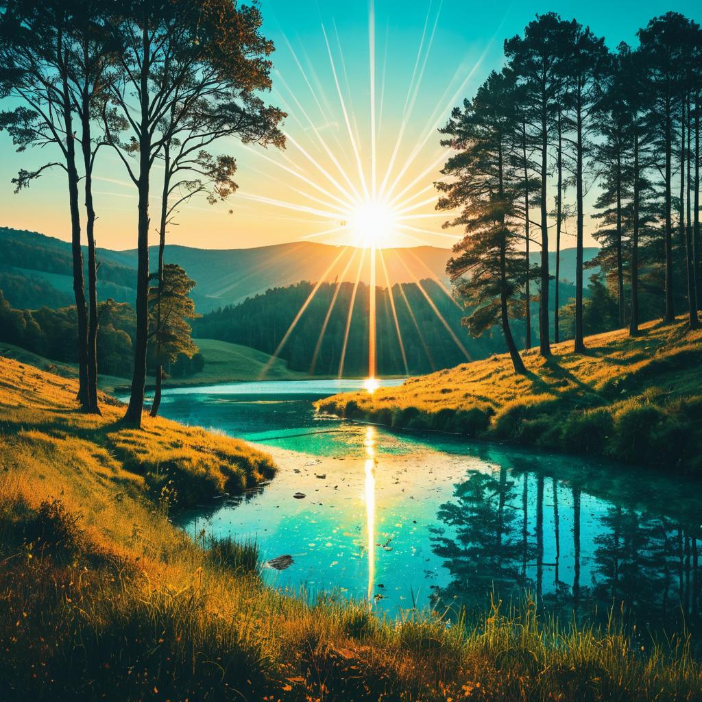 Vibrant abstract digital art depicting a mountain scene with tall pine trees and their reflection in a calm lake. Bright sun rays shine in the background, enhancing the multi-colored geometric shapes and layered patterns in blue, green, yellow, and purple tones.