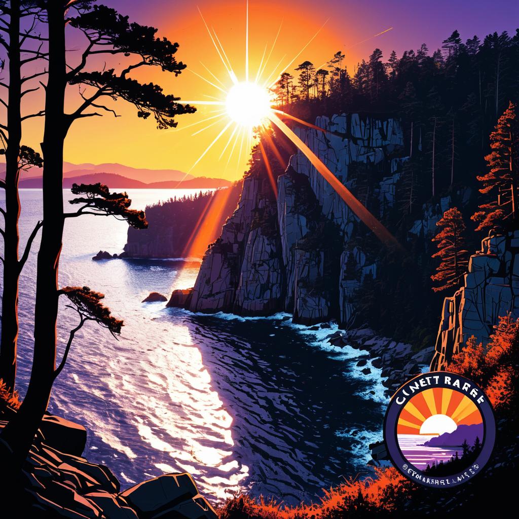Fill Flash digital patch of serene mountain scene, forest next to an azure lake, geometrical nature patterns mixed with cool winter hues, conservation centered design, colourful sun rays shining through trees and image edges, isolated vector logo image, uneven asymmetrical design, light beams and trees extending past the patch edges