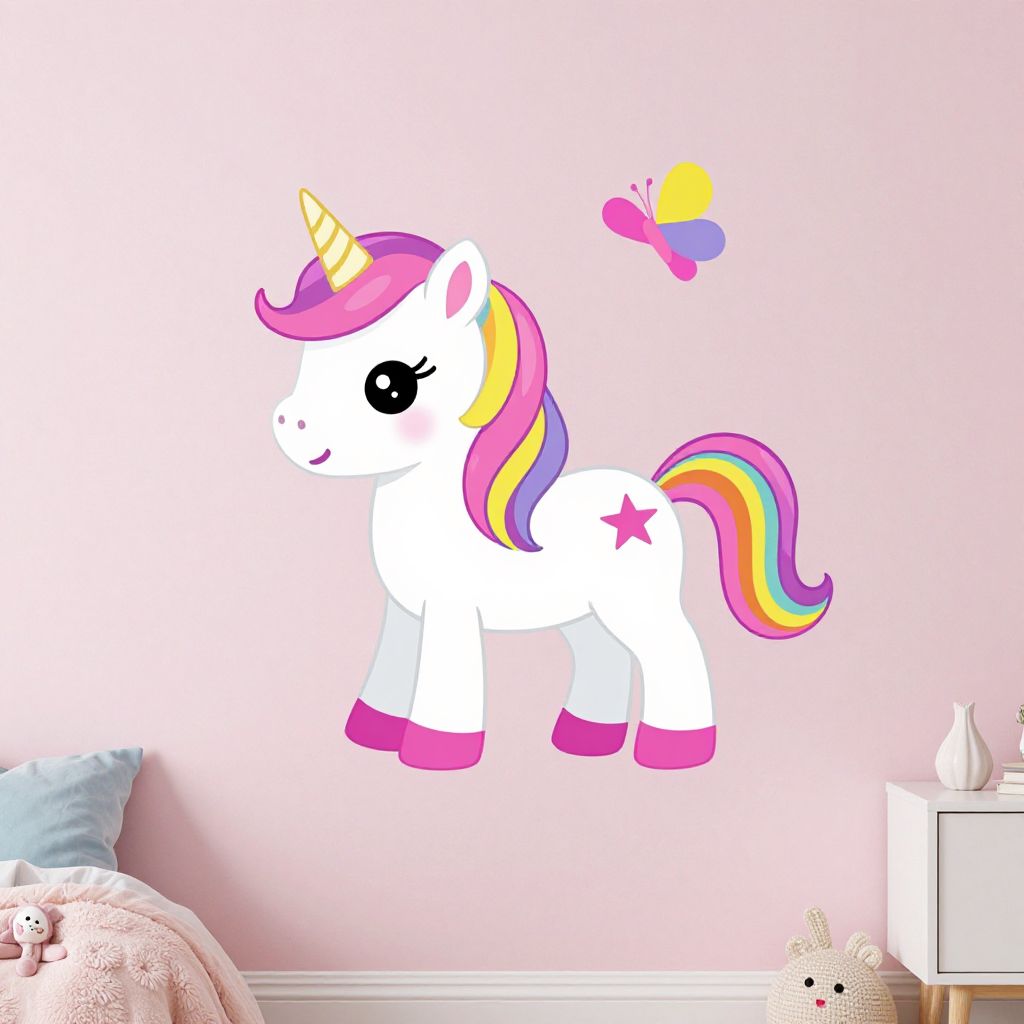 A whimsical cartoon-style wall decal featuring a vibrant baby unicorn with a rainbow mane, pink hooves, and a playful butterfly, set against a pastel backdrop, brings a magical and enchanting touch to a cozy children's bedroom with soft lighting and gentle color tones.