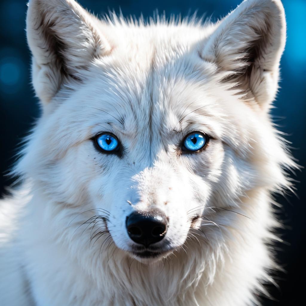 Digital illustration of a glowing white wolf with piercing blue eyes set against a blue background. The wolf is facing the viewer, showcasing sharp animal ears and detailed fur texture with an ethereal aura effect.