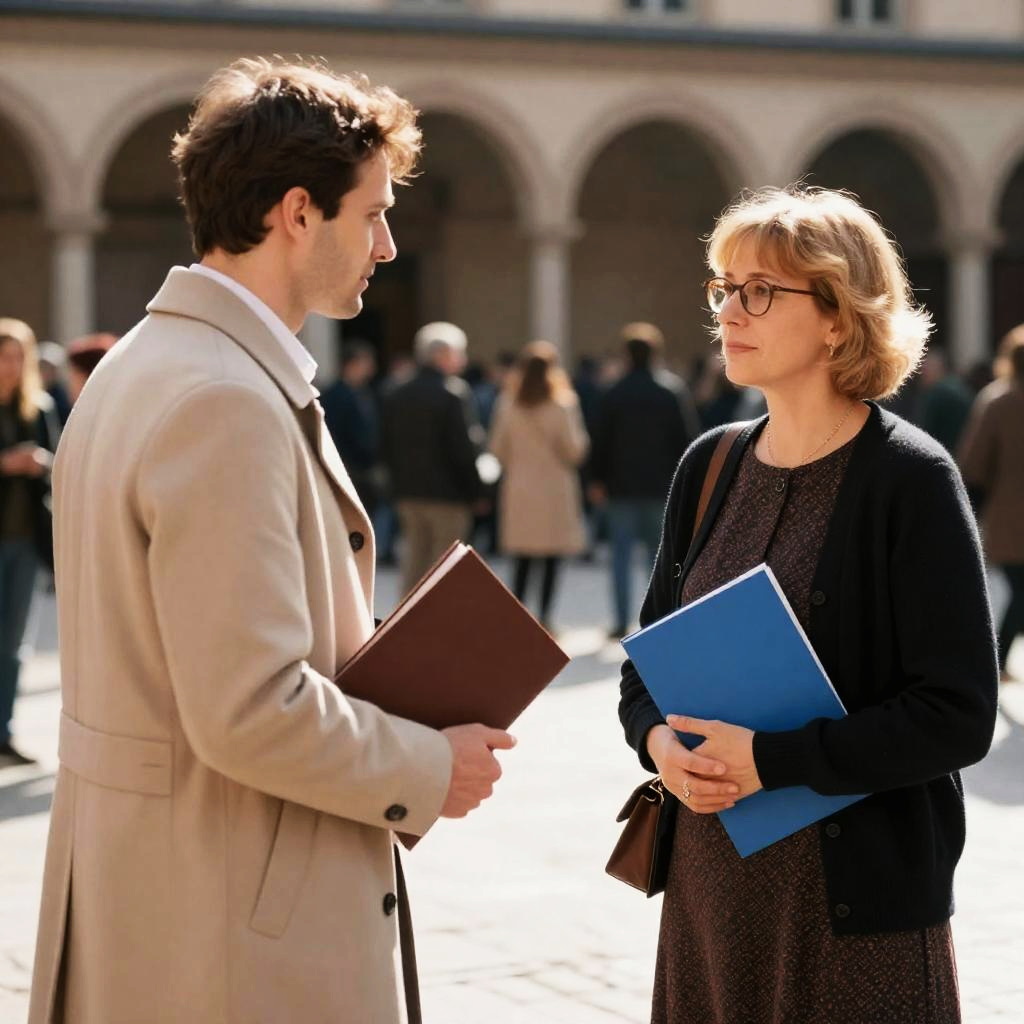 Photograph of two people in an airport. Woman with long brown hair, blue jacket, red scarf, and ID badge, smiling, standing left. Man with blond hair, green jacket, holding papers, looking down, standing right. Background: airport doors, people.