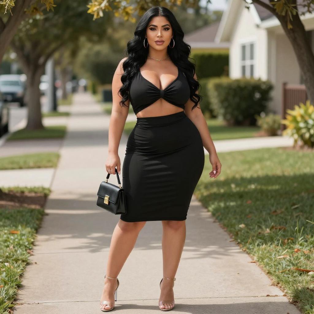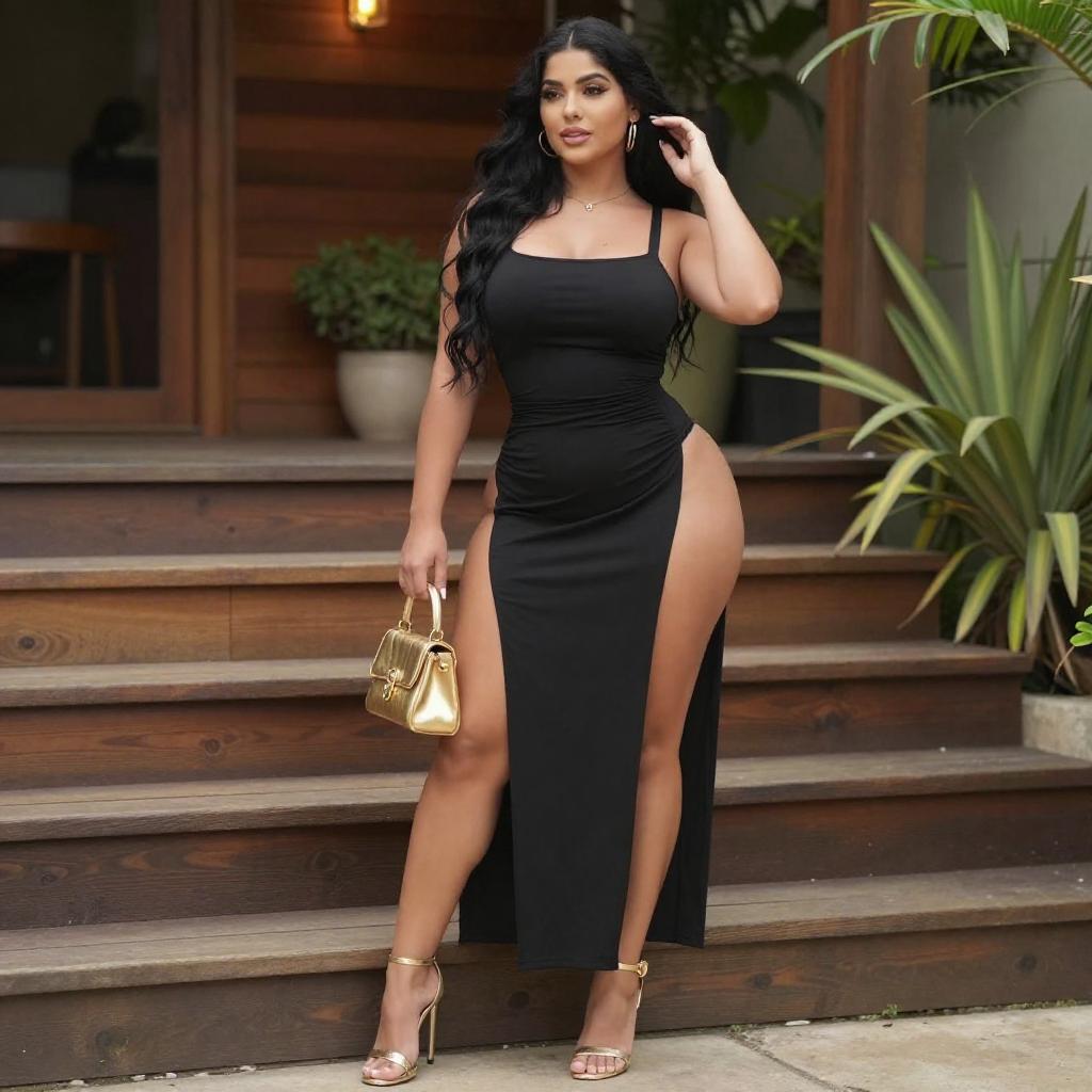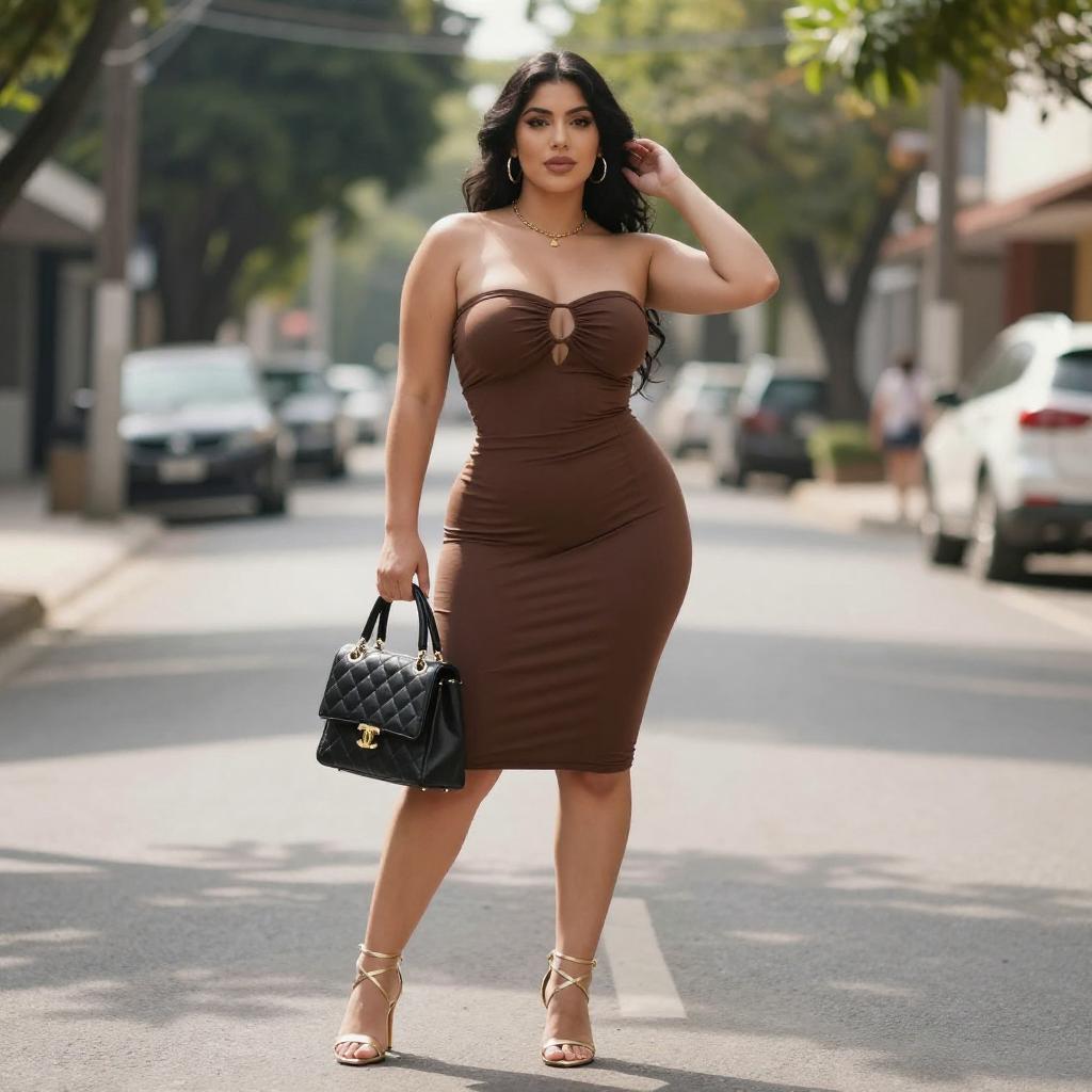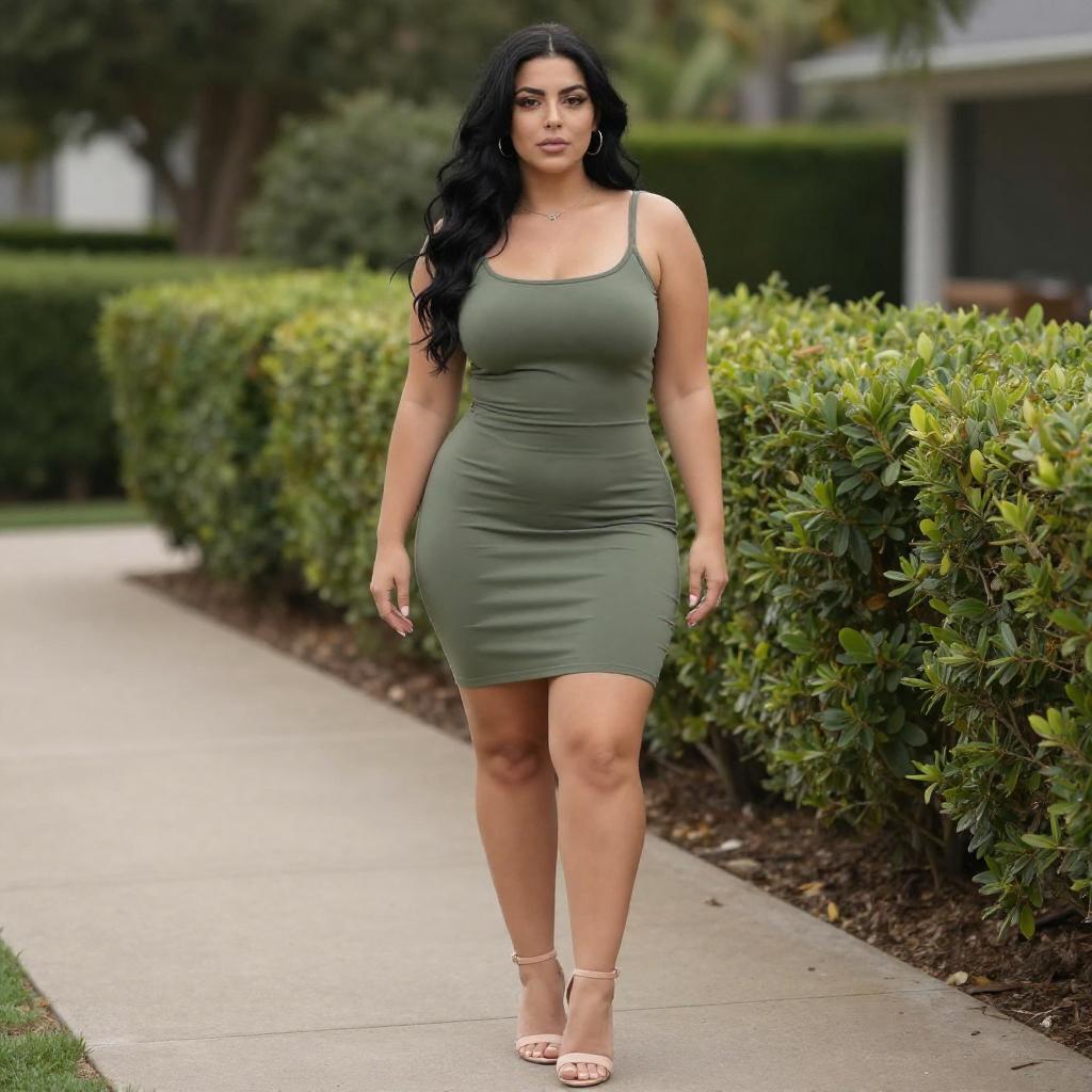 Photograph of a curvy woman with long dark brown hair, wearing a tight, neon green, spaghetti-strap mini dress with a bow at the chest. She stands confidently with one hand on her hip, the other resting on a yellow wall. Her red lipstick contrasts with her fair skin. The background shows a blurred urban setting with a building.
