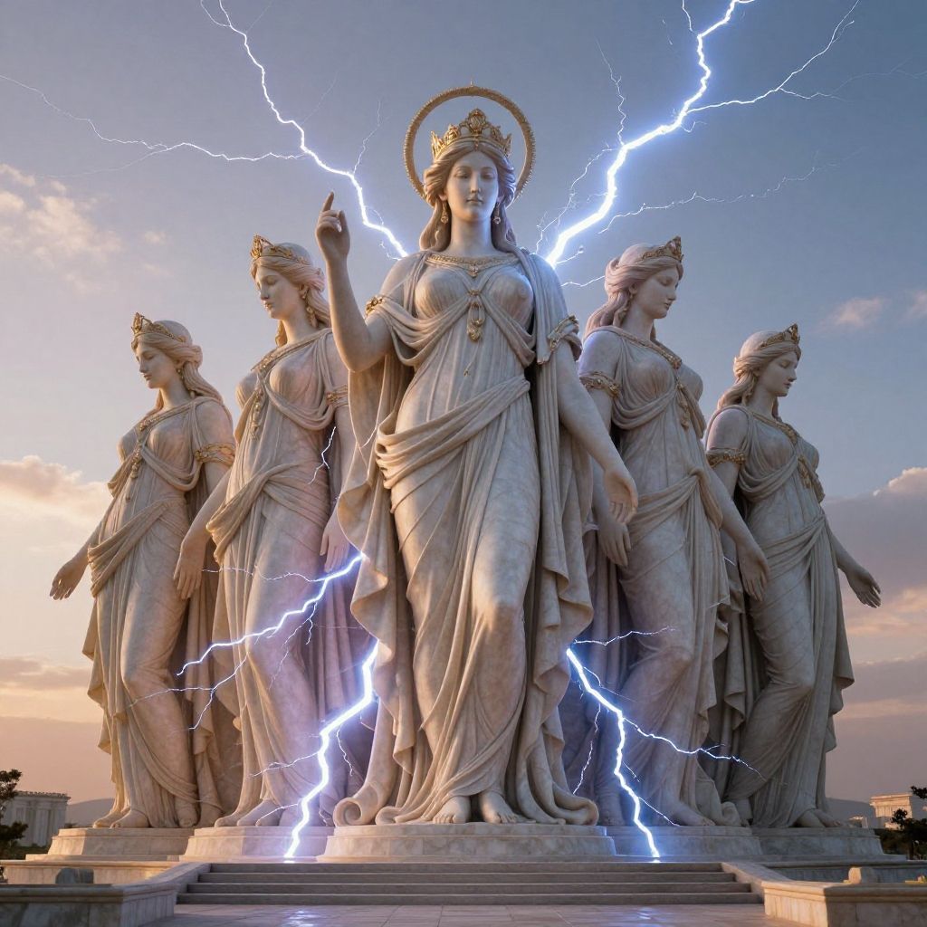 Photograph of a marble statue of six Greco-Roman style female figures, each wearing draped robes and laurel wreaths. The central figure, with an outstretched right arm and index finger pointing upwards, is surrounded by bright blue lightning bolts. The statues are positioned in a semi-circle against a twilight sky with soft pink and orange hues. The marble has a smooth texture, and the lightning adds a dramatic, electrifying effect. The background includes faintly visible city buildings. The overall composition is dynamic and powerful, highlighting the central figure's commanding presence.